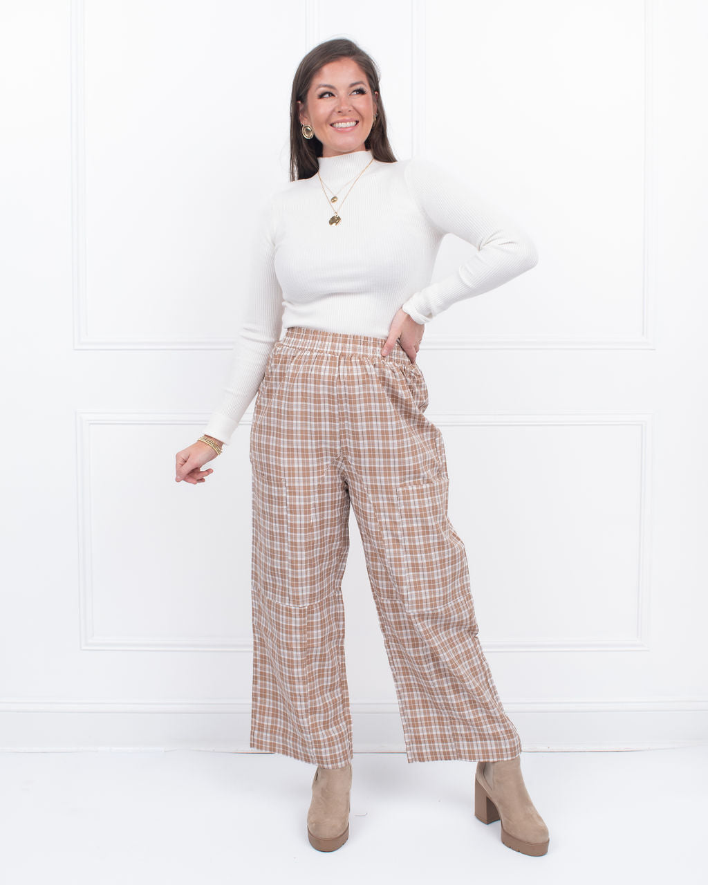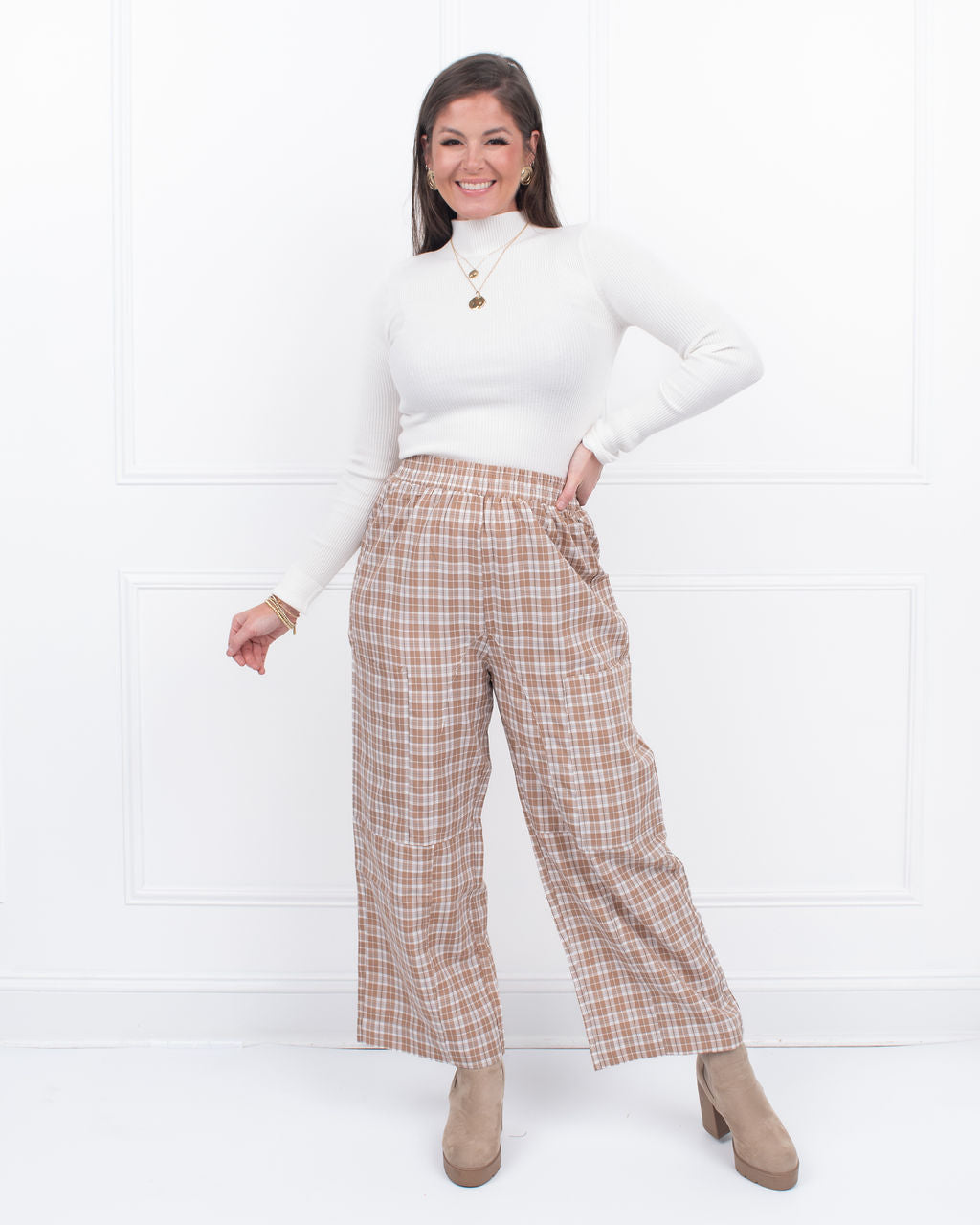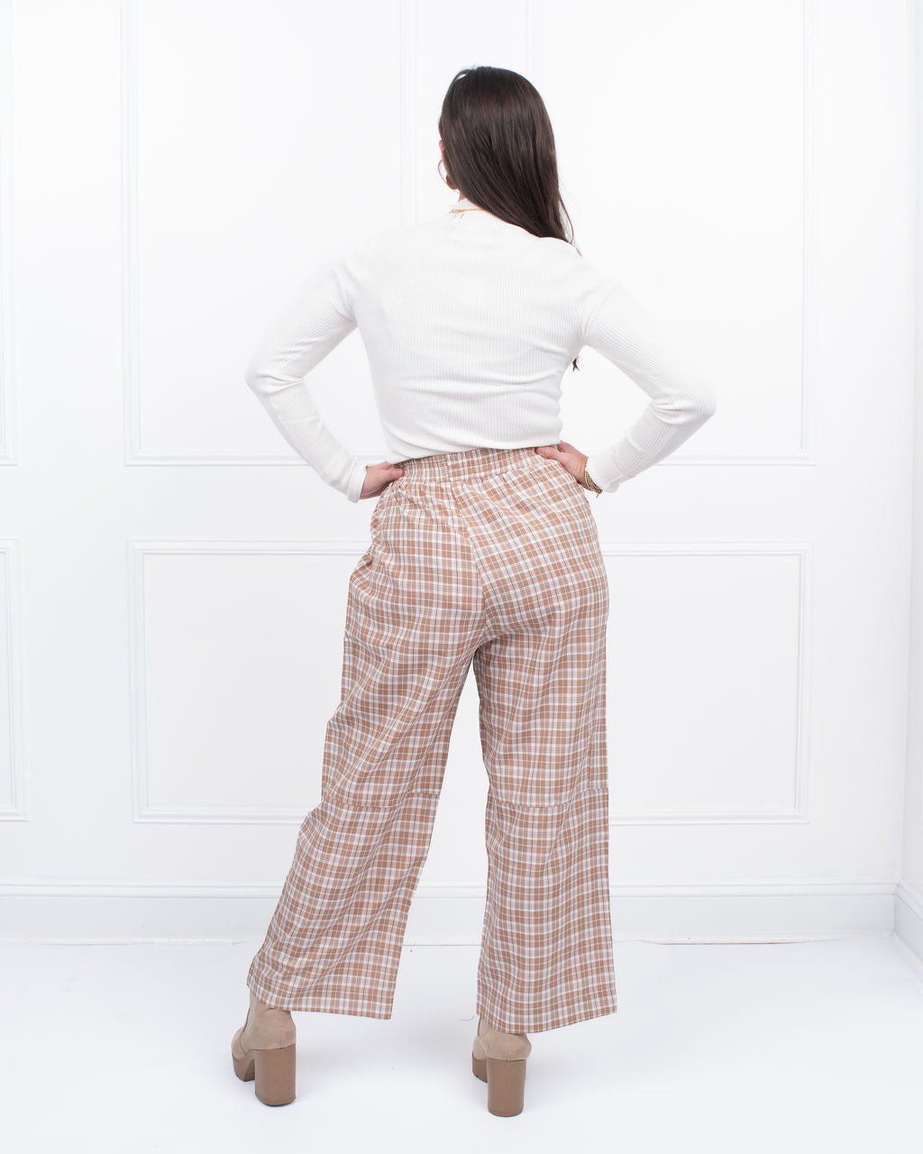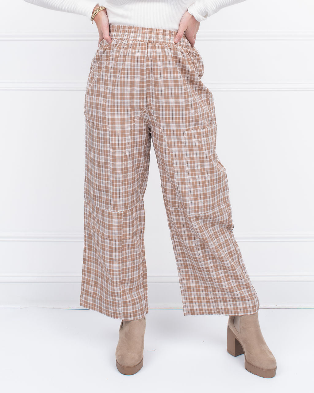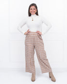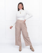 These Coffee Plaid Wide Leg Pants feature a check pattern with a large patch detail, combining style and comfort. Crafted from lightweight 100% polyester, they offer breathable wear ideal for all-day use. Elastic waist. The coffee and ivory color palette adds a sophisticated touch, making these pants a versatile addition to any wardrobe. Their wide-leg cut ensures ease of movement while maintaining a polished silhouette.