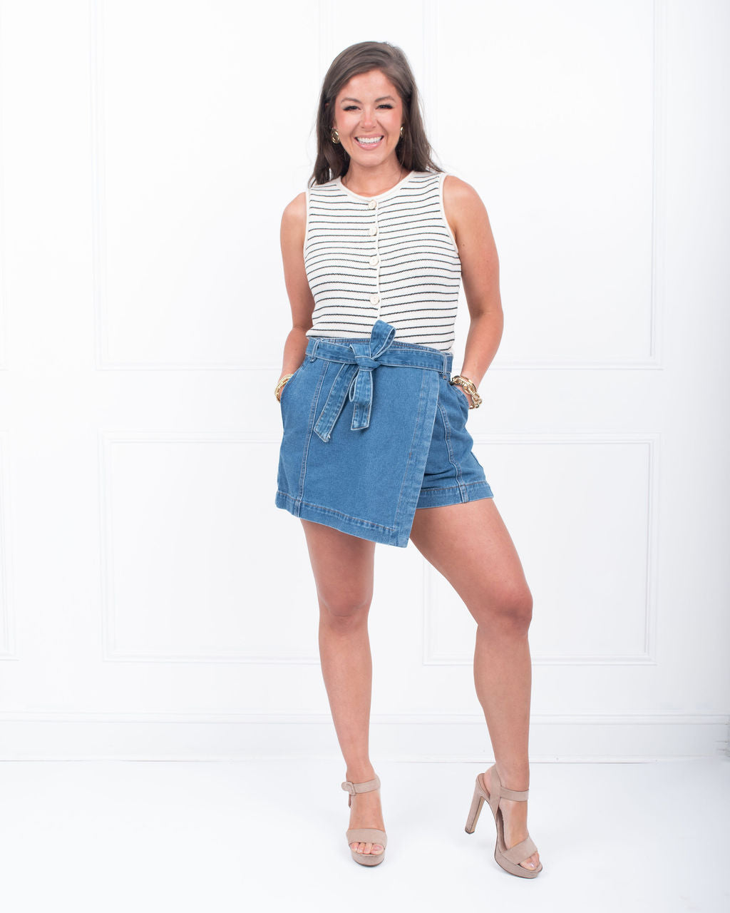 Effortlessly combine style and comfort in our Sweet Denim Skort. Made with a belted wrap design and functional belt loops, this skort offers versatility and a flattering fit. With side and back pockets, it's also practical for storing essentials on the go. Perfect for a chic and functional wardrobe