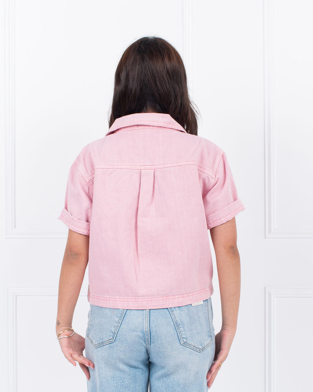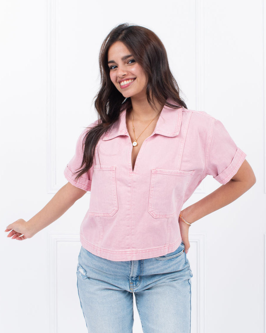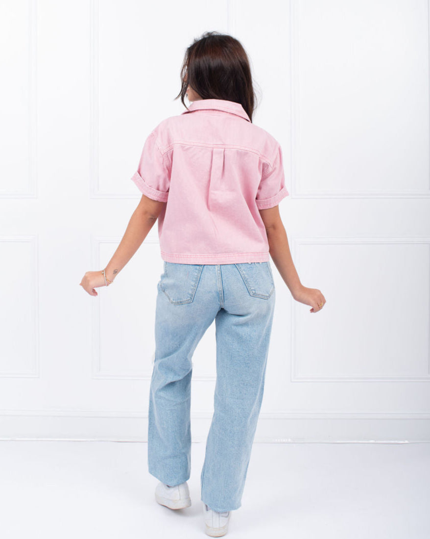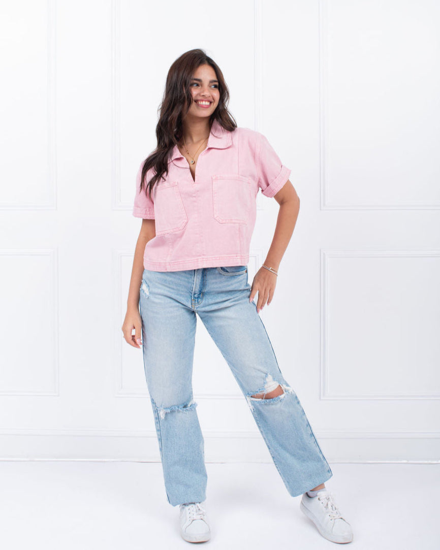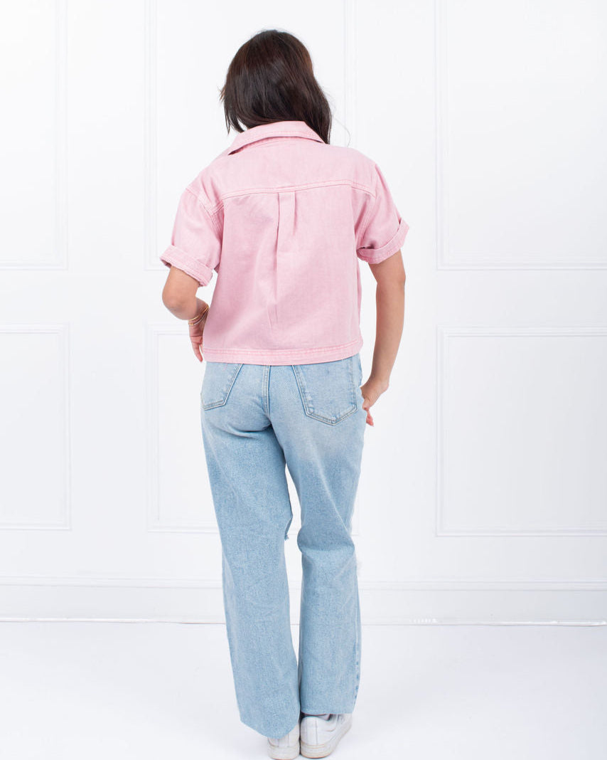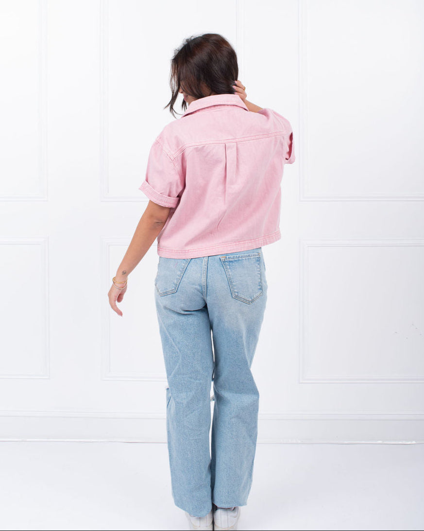Introducing our Bubblegum Breeze Denim Top, the perfect addition to any wardrobe. This top features a stylish bubblegum pink color, collared design, and convenient pockets. Made from 100% cotton, it offers both comfort and style. Part of a 2-piece matching set; versatile for any outfit!