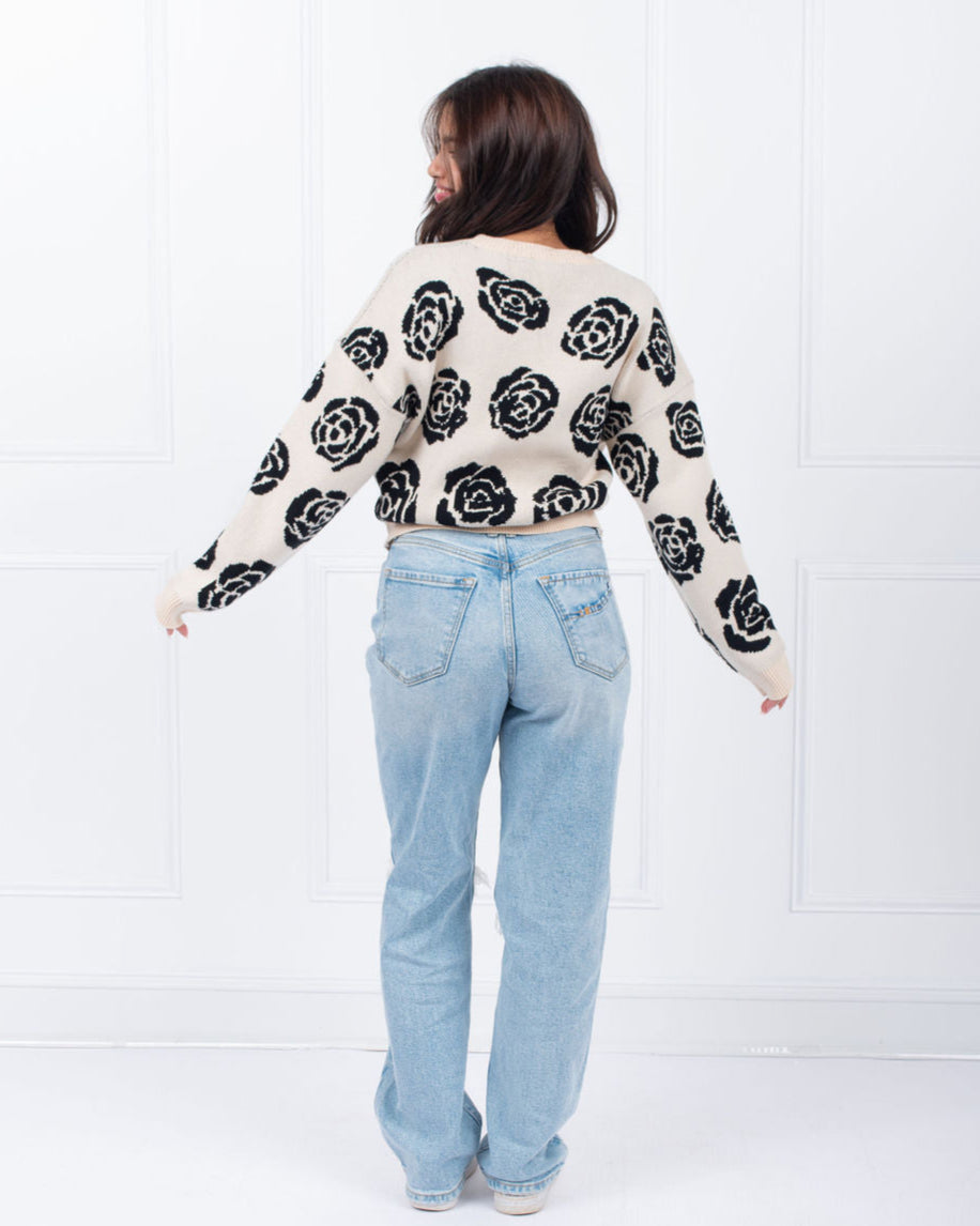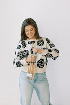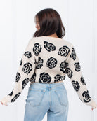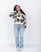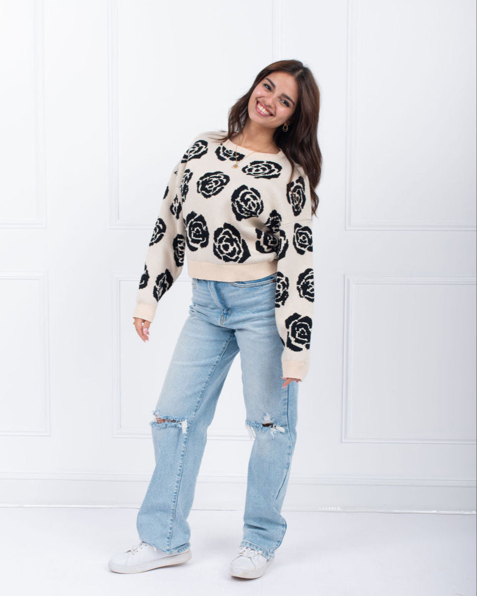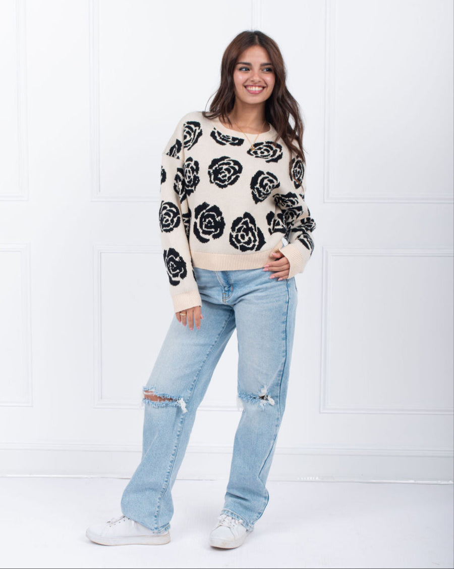 Made with a stylish black and oatmeal rose design, this pullover sweater is sure to elevate any outfit. Perfect for any occasion, this cozy and chic sweater is a must-have for any fashion-forward individual. Black/oatmeal sweater with black roses throughout.
