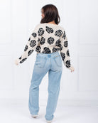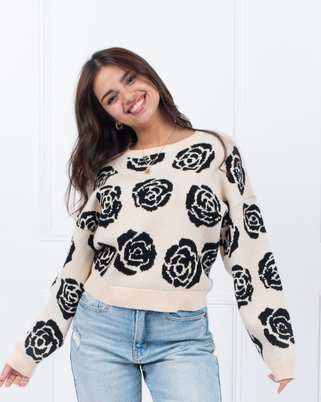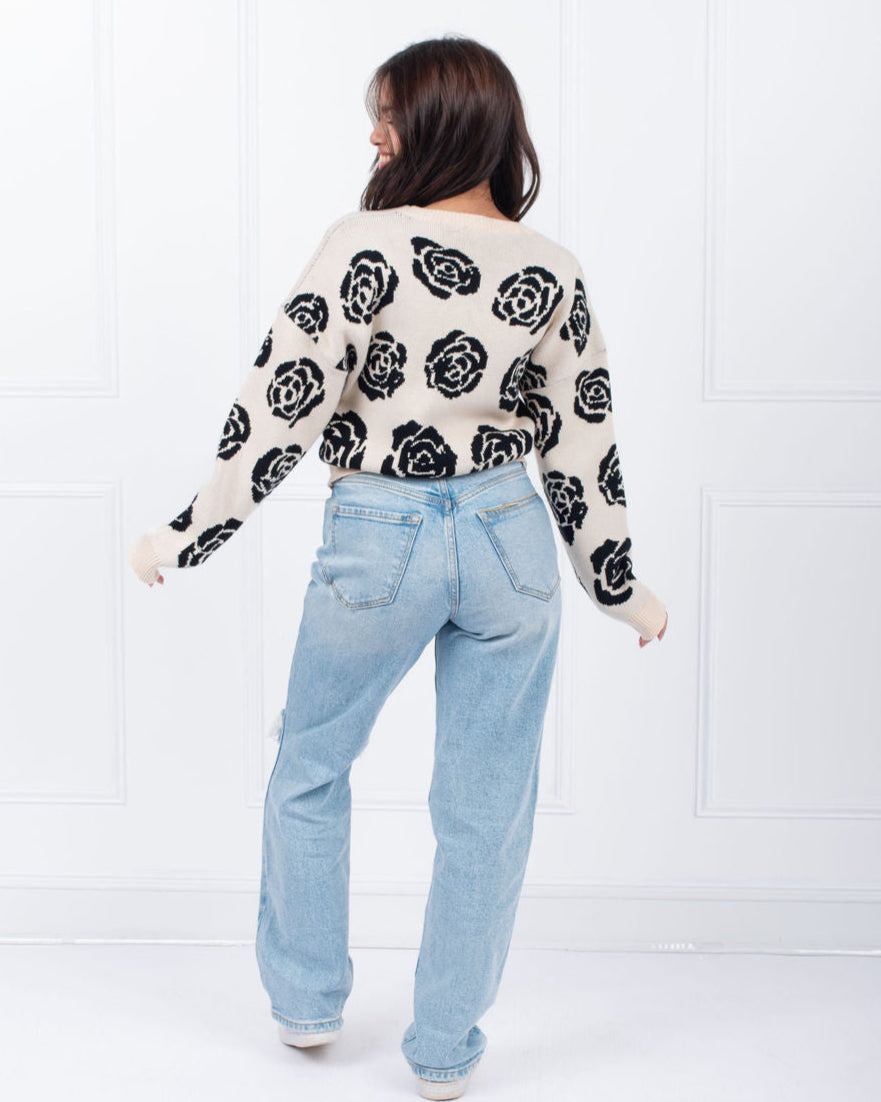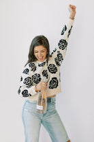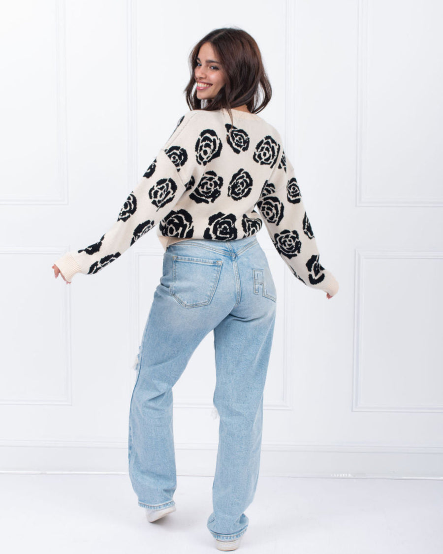 Made with a stylish black and oatmeal rose design, this pullover sweater is sure to elevate any outfit. Perfect for any occasion, this cozy and chic sweater is a must-have for any fashion-forward individual. Black/oatmeal sweater with black roses throughout.