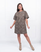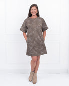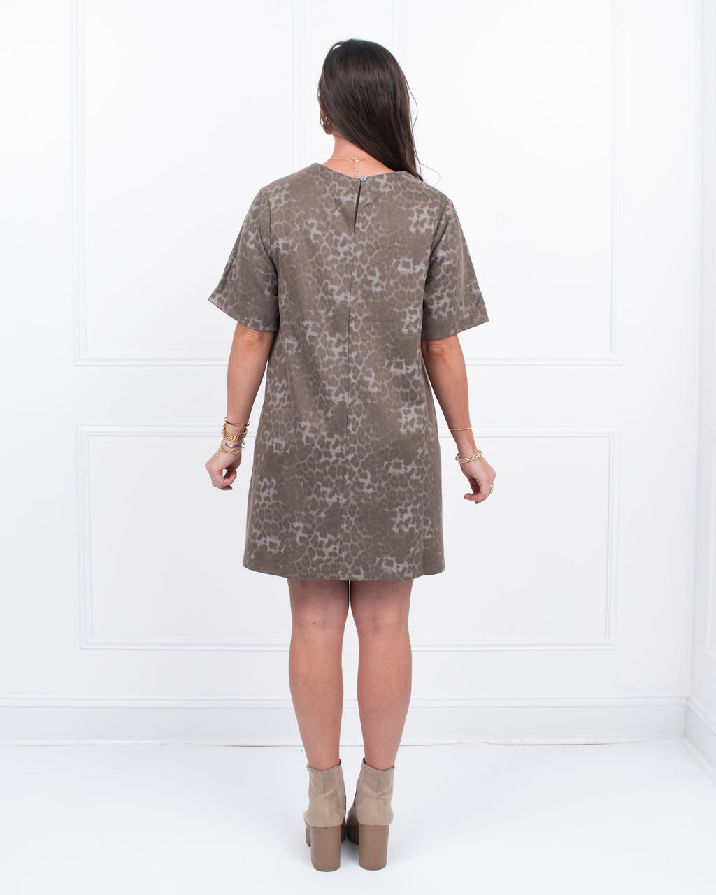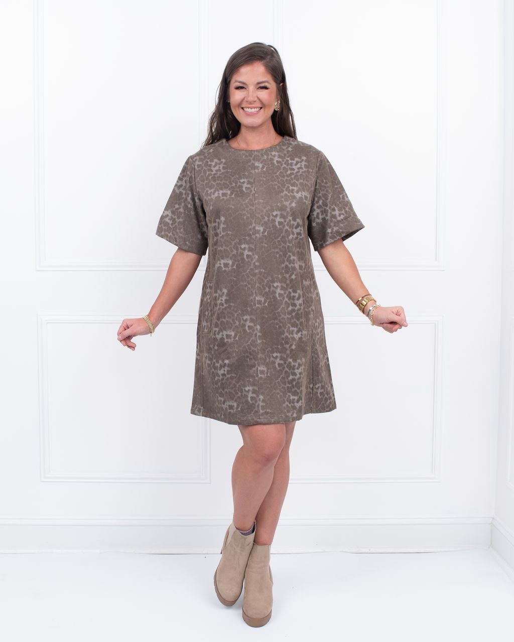 Crafted from soft suede with just the right amount of stretch, the Animal Instincts Suede Dress offers a flattering fit and comfortable wear. Its olive grey animal print adds a sophisticated edge, while short sleeves keep the look versatile. Practicality meets style with discreet pockets, making this mini dress a perfect choice for day-to-night wear.