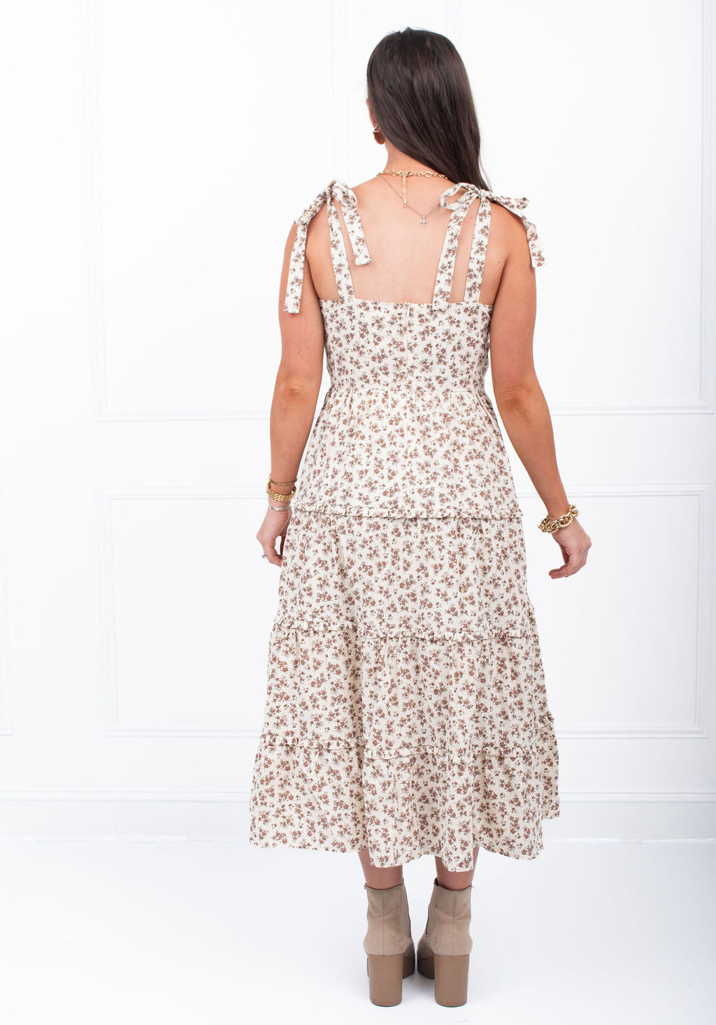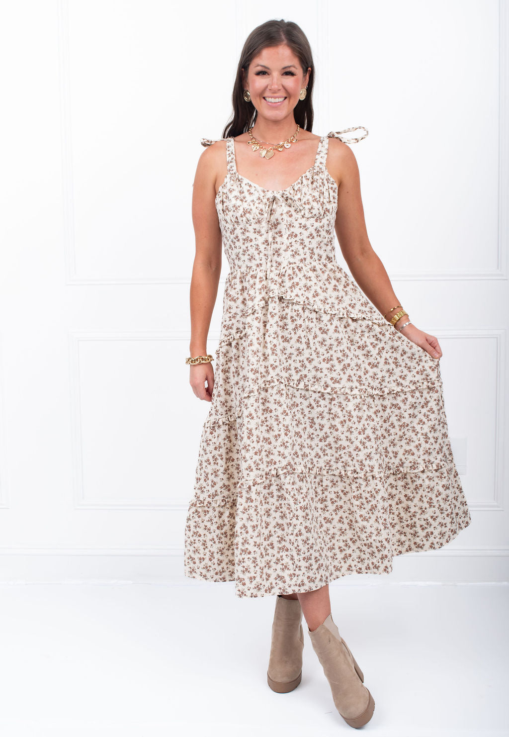 Embrace timeless elegance with the Autumn Bloom Ivory/Brown Floral Dress. Crafted from 100% cotton, this midi dress features delicate ivory and brown floral patterns layered in graceful tiers. The adjustable straps ensure a personalized fit, while the fully lined design offers comfort and modesty. Perfect for seasonal transitions