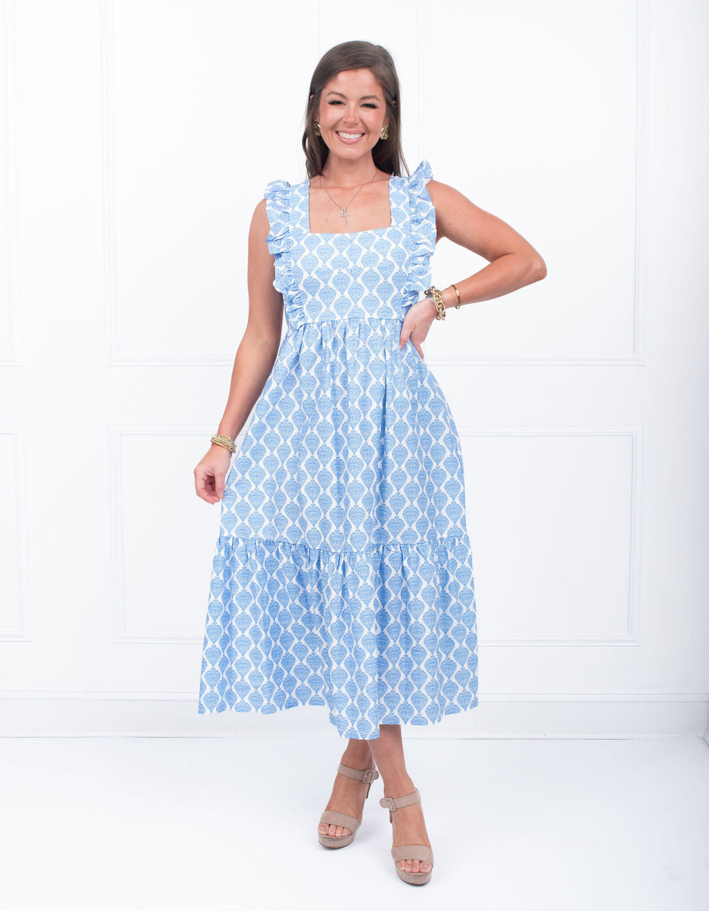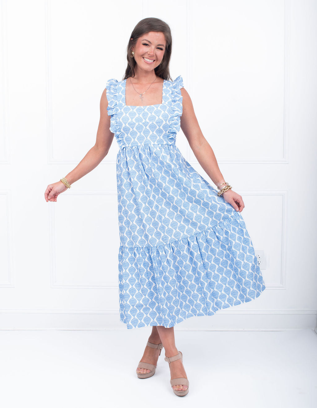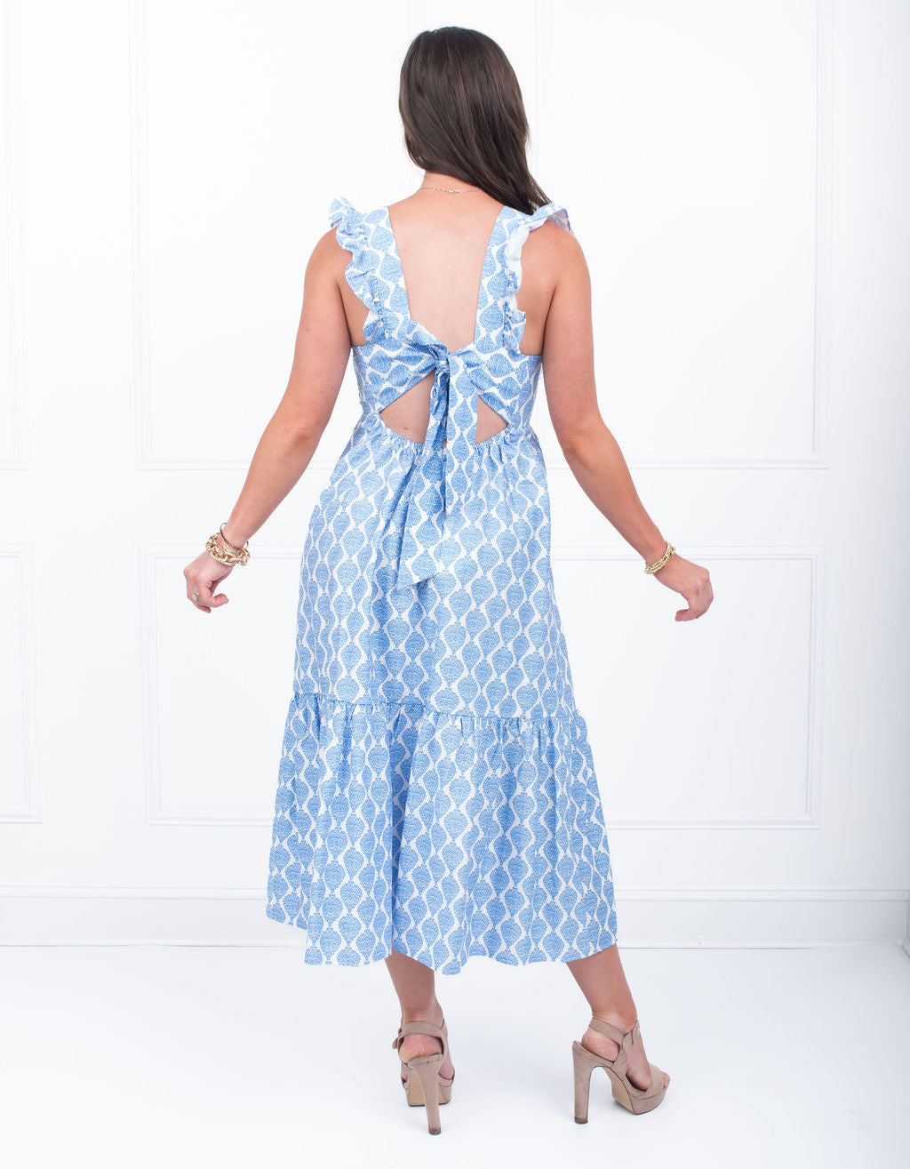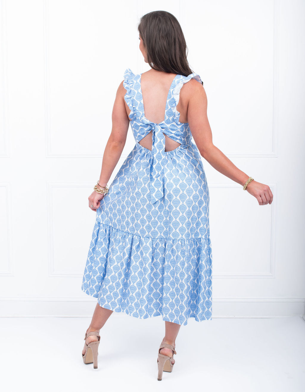 Expertly crafted with 80% rayon and 20% nylon, the Bluebell Twirl Dress features a flattering, sleeveless design with a tie back and elastic waist for a comfortable and stylish fit. The midi length and 100% polyester lining adds a touch of elegance to this blue and white dress