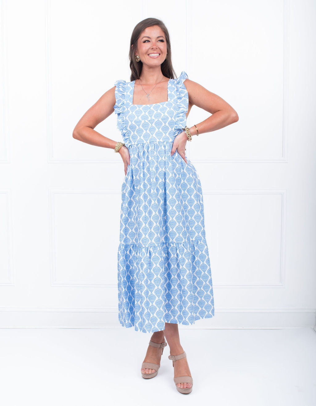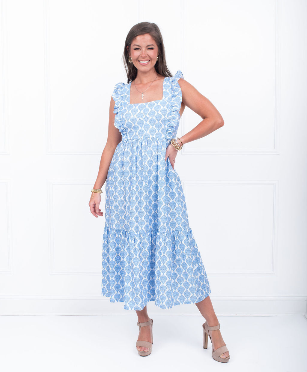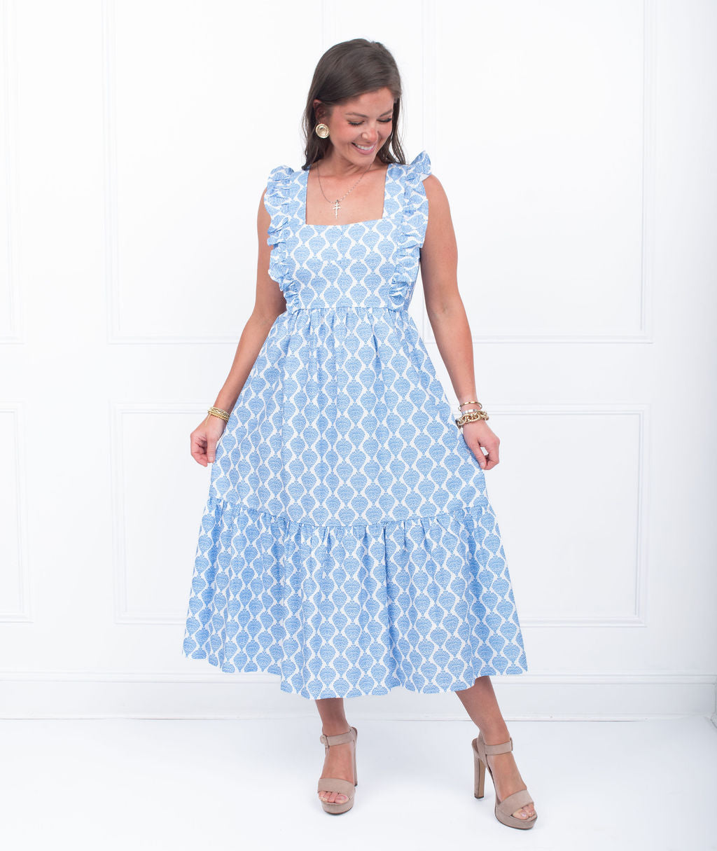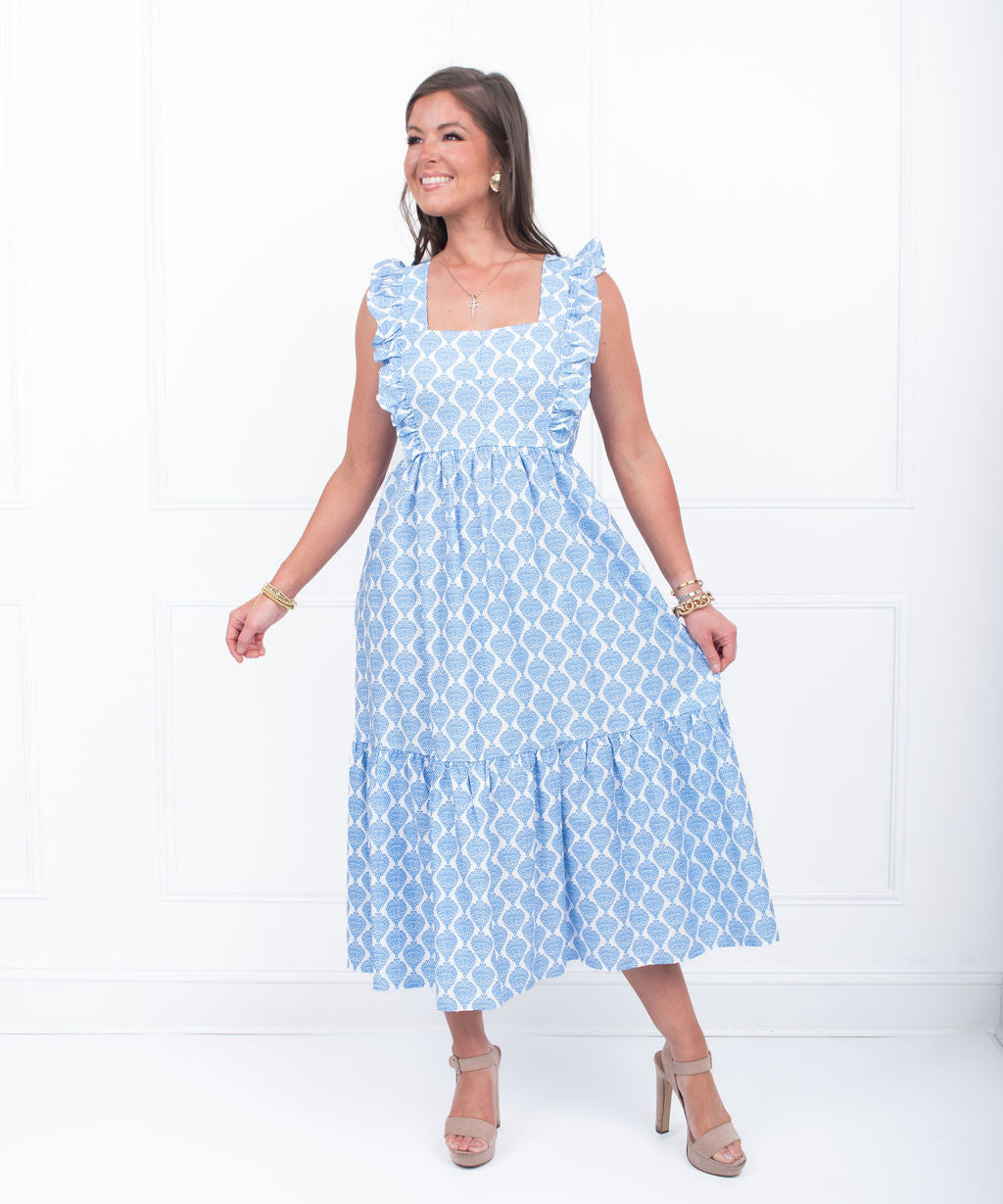 Expertly crafted with 80% rayon and 20% nylon, the Bluebell Twirl Dress features a flattering, sleeveless design with a tie back and elastic waist for a comfortable and stylish fit. The midi length and 100% polyester lining adds a touch of elegance to this blue and white dress