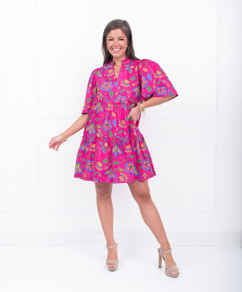 Spruce up your wardrobe with our Magenta Punch Multi Dress! This floral split neck shift dress is not only stylish, but also functional with pockets. Made from 100% cotton, it's perfect for any occasion. And don't forget the small ruffle tiered design for an extra touch of fun