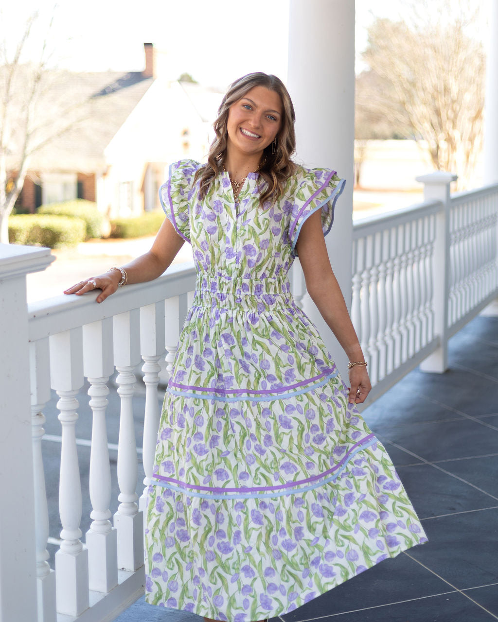 Twirl into spring in the Georgia Lilac Dress, where whimsical ruffled sleeves meet a charming woven floral print! This tiered midi silhouette flatters every figure while the elastic waistband keeps you comfy all day long. Contrast binding details add a polished touch, and hidden pockets? Yes, please! Soft lilac and green hues make this the ultimate seasonal essential that's equal parts fun and effortlessly chic. Lined.