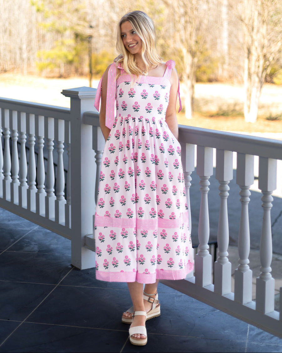 Twirl into sweetness with this dreamy dress featuring an absolutely stunning pink stripe and block print design that's pure eye candy! Adjustable tie straps let you customize the fit, while the smooth, creamy fabric feels gentle against your skin. The smocked back adds a touch of gathered elegance and extra comfort. Be sweet as strawberry cream in this beautiful pink dress!