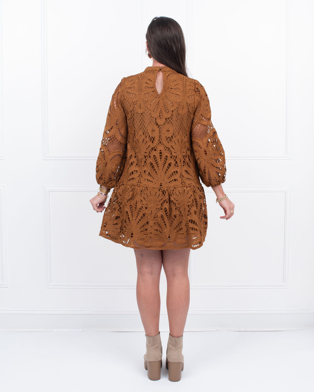 Embrace warmth and whimsy in the Cinnamon Spice Lace Dress. This beautiful piece features a rich tan damask lace pattern, charming ruffle detail, and a wide scalloped hem that dances with every step. With 3/4 sleeves, a mock neck, and a delicate back keyhole button, it’s perfect for turning heads with effortless style. Crafted from 100% polyester.