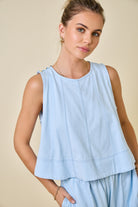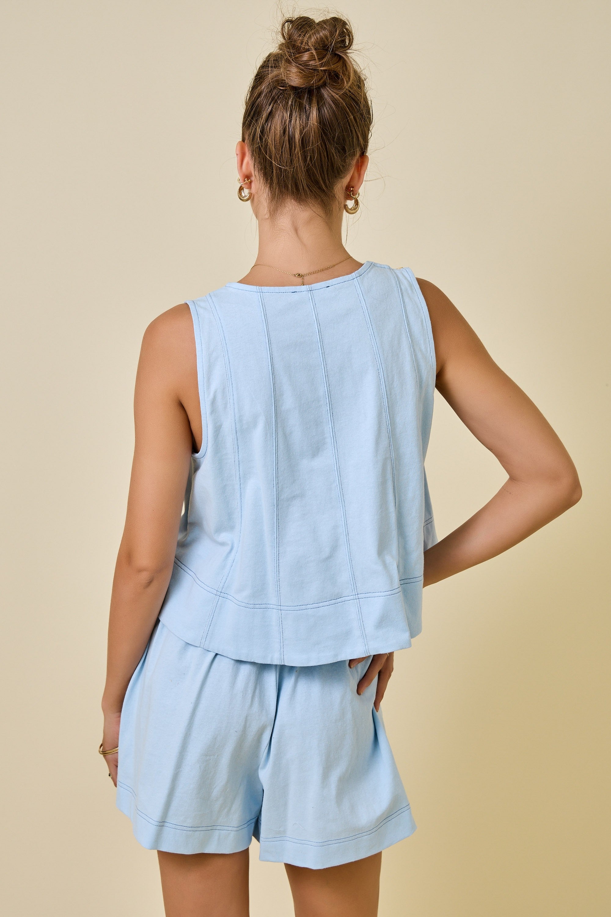Breezy days just got better. This sleeveless tank features a laid-back fit with a slightly cropped silhouette that's perfect for layering or wearing solo. Soft light blue fabric is elevated by crisp contrast line stitching that adds just the right amount of visual interest. Effortlessly cool and endlessly versatile—throw it on with your favorite jeans, linen pants, or slip it under an open shirt for that just-right vibe.