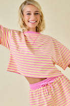 Slip into effortless comfort with our Pink Lemonade Top—a boxy terry tee that's as fun as it sounds! Crafted from stretchy, cozy material that moves with you, this slightly cropped style features a chic contrast neckband for added visual interest. Perfect for casual days when you want to feel relaxed without sacrificing style. Layer it, dress it down, or wear it solo—this versatile piece is your new go-to for laid-back vibes.