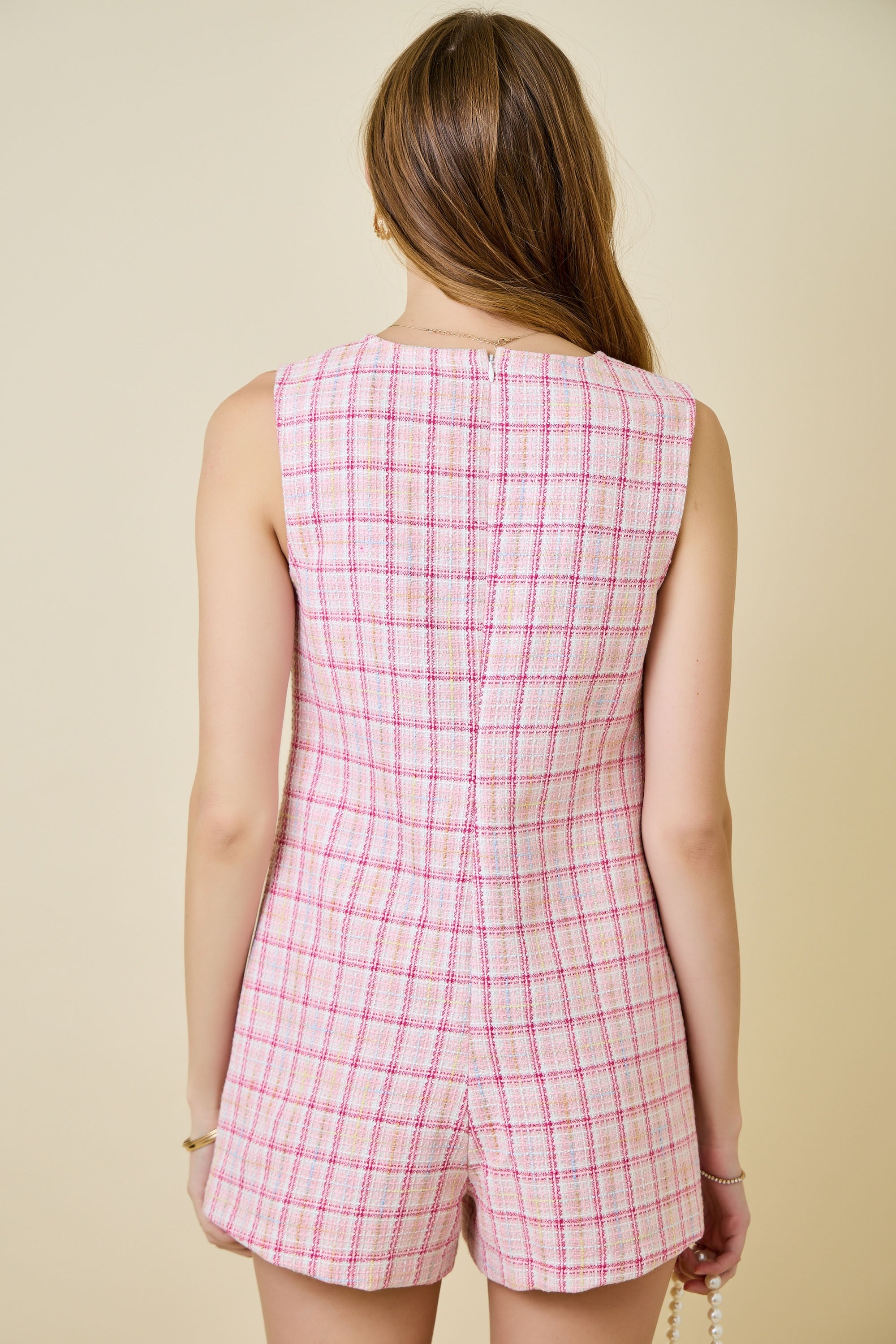 Make a statement in this Rosé All Day Tweed Romper—a sleeveless stunner! Luxe gold pocket details add a touch of glamour, while the back zipper creates an effortlessly chic silhouette. Crafted from structured tweed fabric for a polished, put-together look that works from brunch to evening plans. This is THE romper of the season!