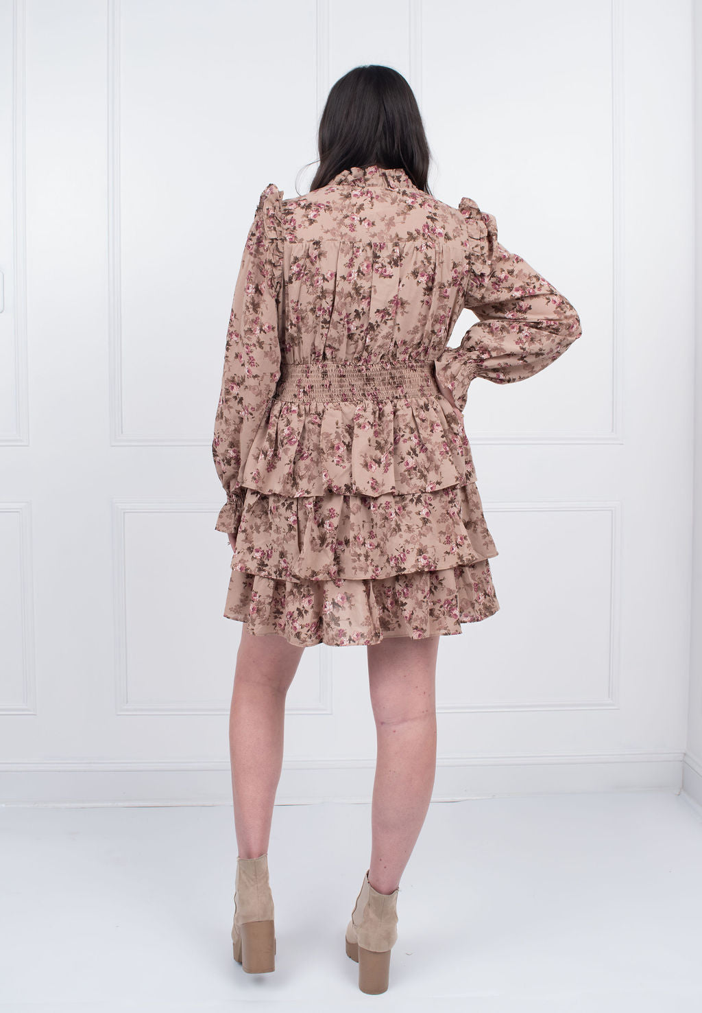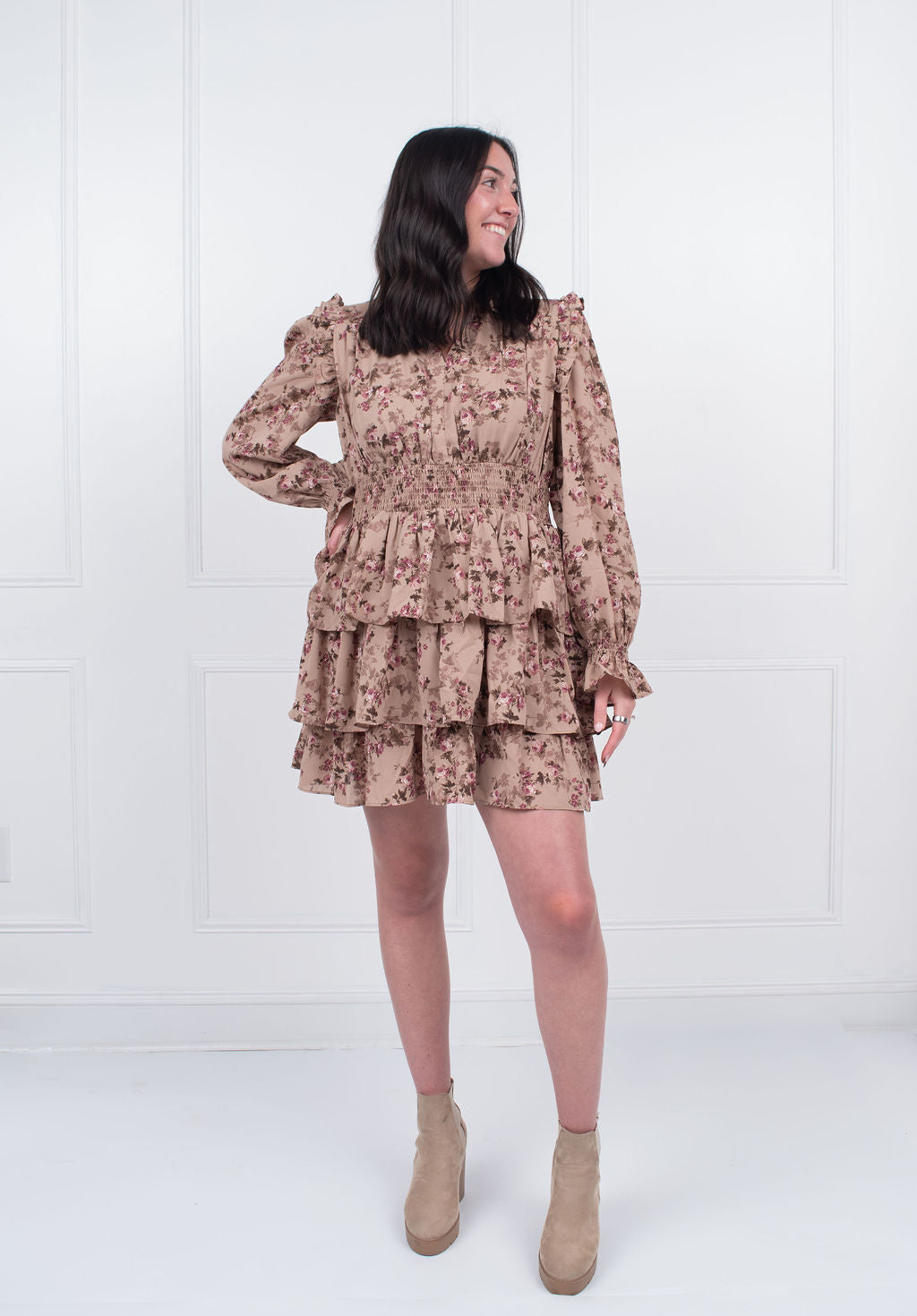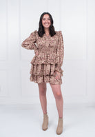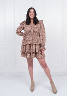 Embrace breezy, boho vibes with the Rustic Rose Dress. Its mocha Musse fabric feels soft against your skin, while the elastic smocked waist and wrists offer a comfy, flexible fit. Playful tiered ruffles and delicate floral weaving bring a flirty charm! Perfect for any event, pair with booties!