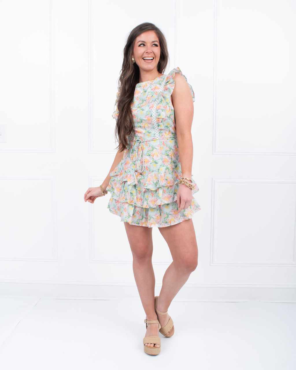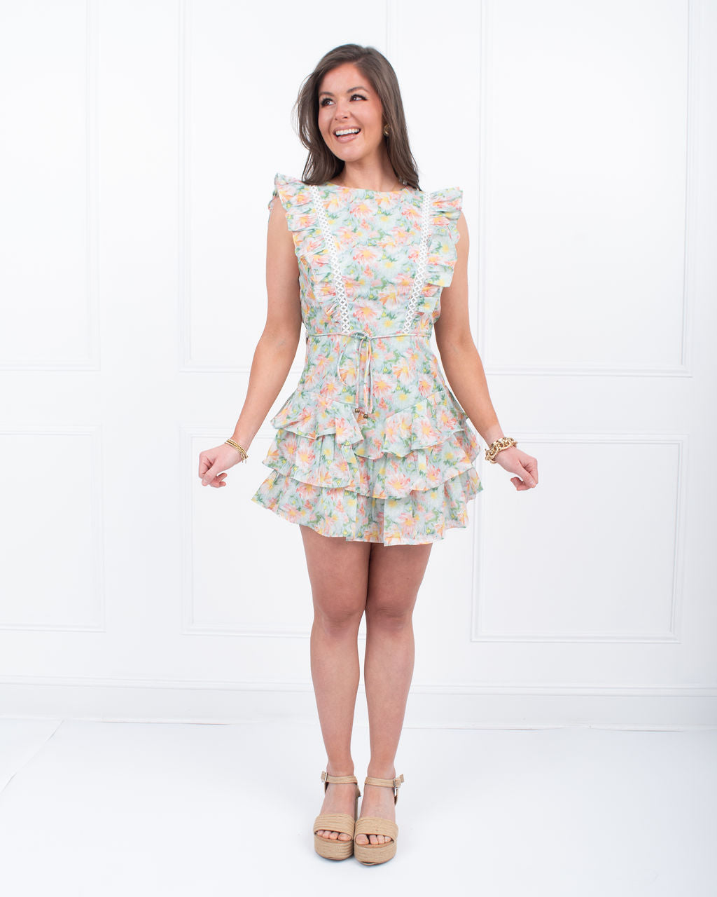 Upgrade your wardrobe with our Afternoon Tea Party Romper. This versatile and stylish romper features a sleeveless boat neckline romper with a waist tie floral print, an open back, and a tiered design. Made from 65% cotton and 35% polyester, this romper is both comfortable and fashionable. Perfect for any occasion, the tie neckline in the back adds a touch of elegance to complete the look! Perfect for a wedding, garden party, or event.