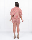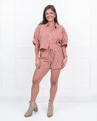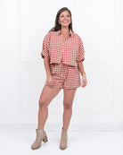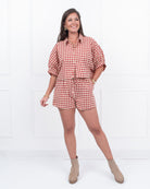 This Check Me Out Gingham Set features a lightweight, breathable blend of 50% cotton and 50% polyester for comfortable wear. The red gingham pattern adds a classic touch, while the cropped button-down shirt pairs perfectly with matching shorts!