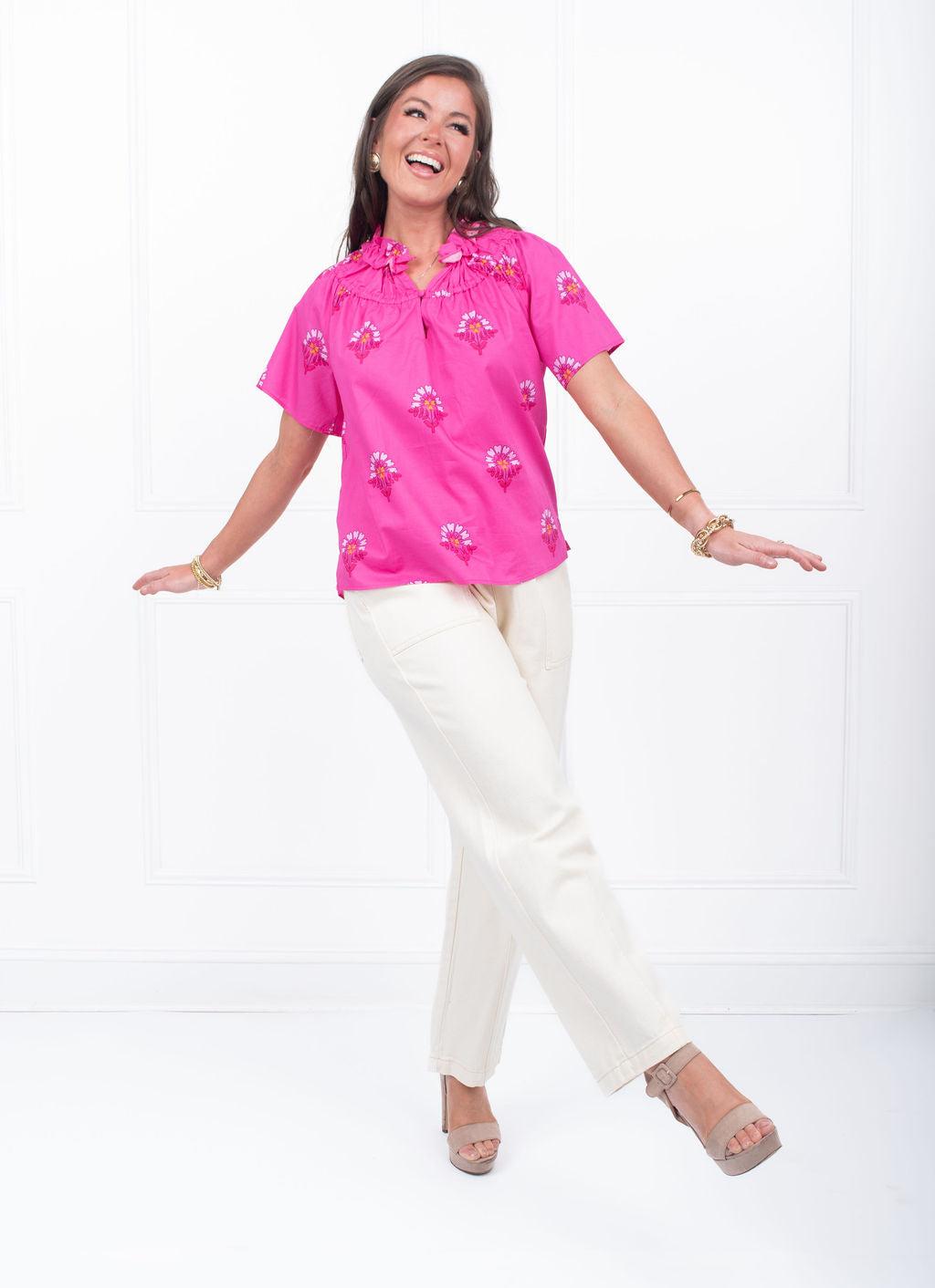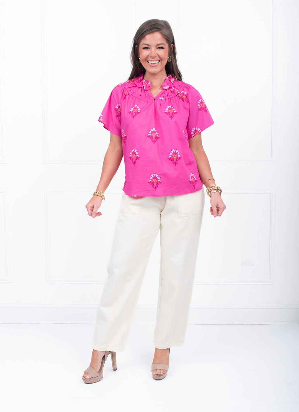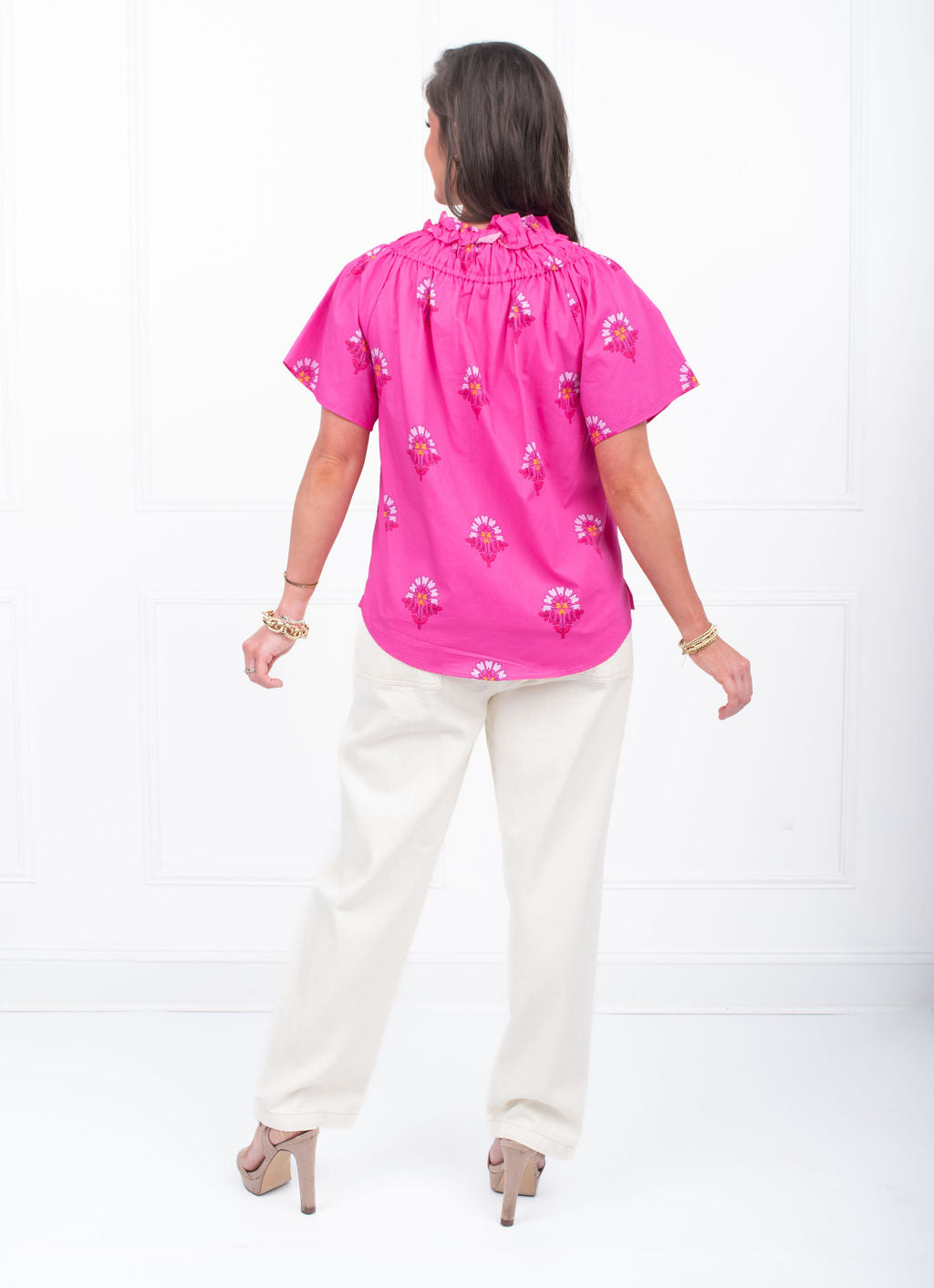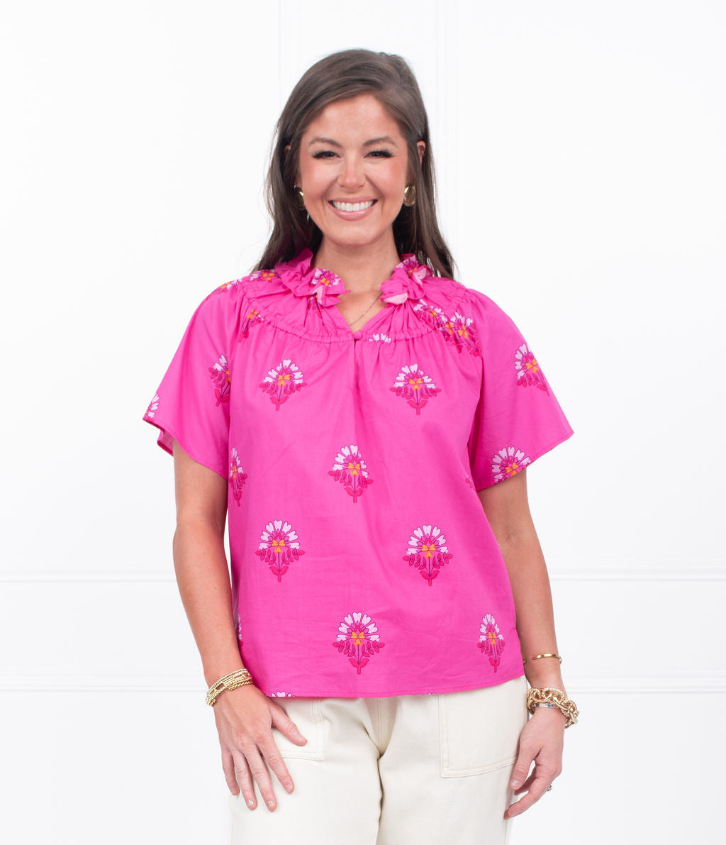Get ready to bloom in our Azalea Fuchsia Top! This playful piece features a vibrant fuchsia pink hue, smocked detailing for a flattering fit, and a charming floral block print design. The relaxed fit and ruffle neck add a touch of whimsy, while the 100% cotton fabric ensures comfort all day long. Button up and embrace your colorful side. Pairs perfectly with cream pants!